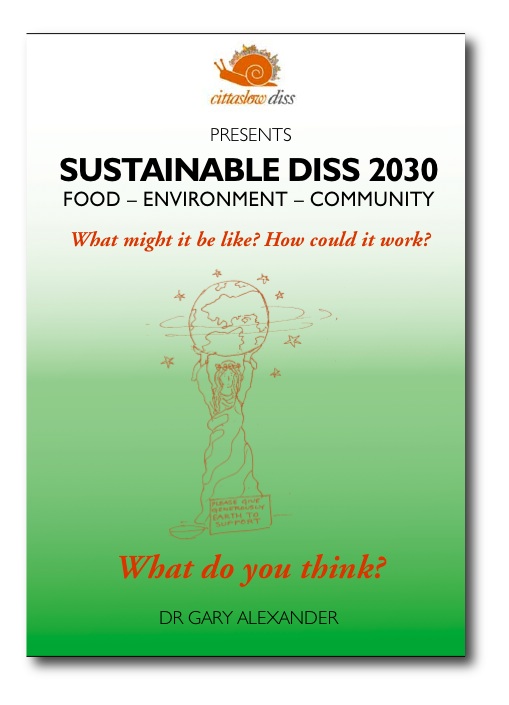 Sustainable Diss 2030 – A short booklet describing a fictional sustainable future in a small British market town that re-invents itself after a financial crash. See especially Chapter 2, The Good News, pages 5 – 32, a description of the future from the perspective of six fictional characters. A light read, with cartoons and illustrations. Download as pdf: SusDiss2030, SusDiss2030cover and map